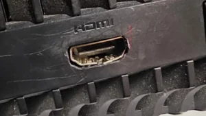 Légende : Un port HDMI endommagé de l’intérieur. Observez les broches tordues.